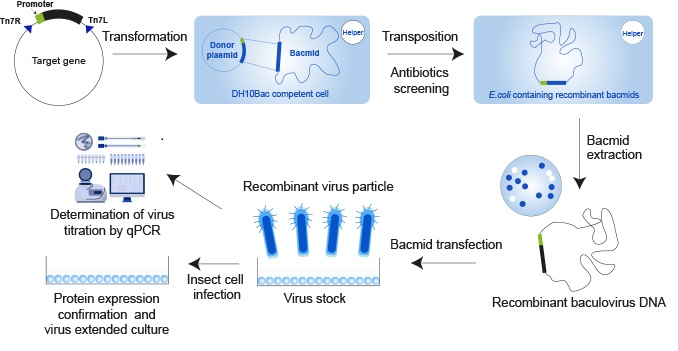 | 2 | ウイルス生成 | リコンビナントバクミドDNAの生成 リコンビナントバクミドDNAによる昆虫細胞のトランスフェクション P1ストック(低力価)、P2ストック(高力価)の生成、および定量PCRによるウイルス力価の測定 抗His/GSTまたは他の抗体でのウェスタンブロットによる、生成したP1およびP2のタンパク質発現を検証 |