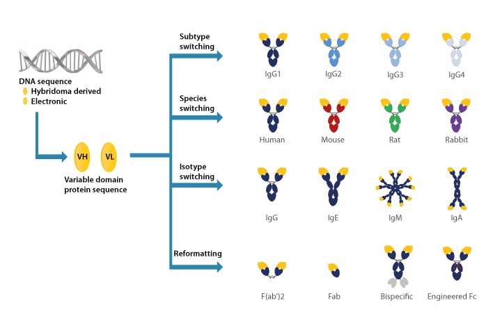 - 抗体の遺伝子情報をもとに、ヒト化を始めとして、動物種、クラスなど様々な改変が可能です(下記参照)。