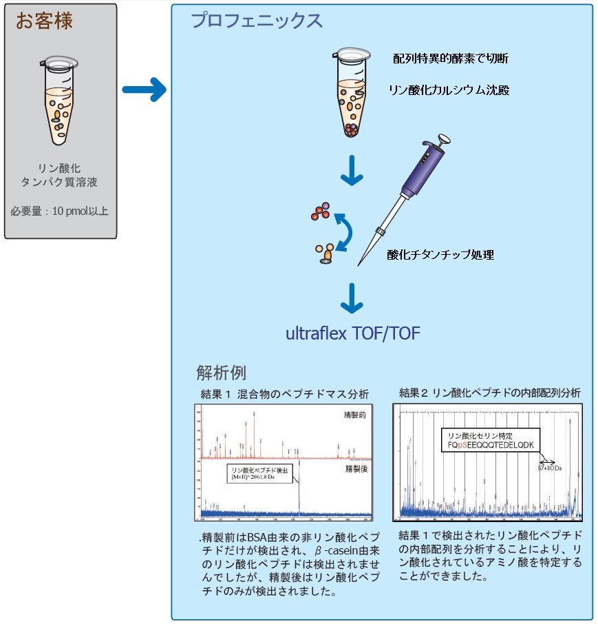 - リン酸化ペプチドの精製について蓄積したノウハウを用いて、リン酸化ペプチドを多段精製して、解析します。