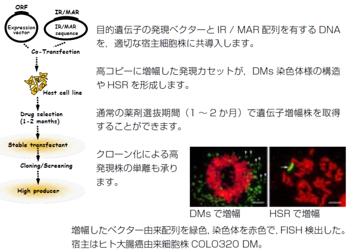 広島大学生物圏科学研究科の清水典明教授らによって発見された方法で、複製開始領域(IR:Initiation Region)と核マトリックス結合領域(MAR:Matrix Attachment Region)と呼ばれる特殊な配列と、目的遺伝子の発現ベクターを培養細胞に共導入します。これにより目的遺伝子が効率的に増幅され、Double Minutes(DMs)様の構造やHomogeneously Staining Region(HSR)を形成します。ゲノム上で多コピーとなった目的遺伝子によって、目的タンパク質の発現量が飛躍的に増大します。この方法は細胞株を選ばず、任意の細胞株でタンパク質高発現株を作製することが可能です。