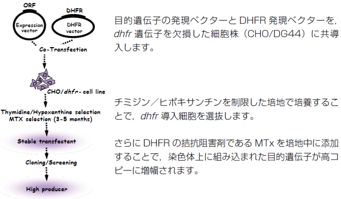 ジヒドロ葉酸リダクターゼ(dhfr遺伝子)を欠損したチャイニーズハムスター卵巣由来細胞株CHO/DG44は、培地中にチミジンとヒポキサンチンを要求する細胞株です。目的遺伝子の発現ベクターとdhfr遺伝子の発現ベクターを共導入します。そこにDHFRの拮抗阻害剤であるメトトレキセート(MTx)を段階的に加えることで、目的遺伝子が複製され高発現株を取得することができます。この方法は、バイオ医薬品の生産の現場で最も頻繁に用いられている方法のひとつです。