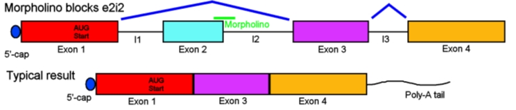 モルフォリノオリゴは、スプライスジャンクションまたはスプライス調節タンパク質の結合部位のいずれかを標的としてスプライシングを改変します。スプライスジャンクションを標的とする場合、25塩基のモルフォリノオリゴは、エクソン配列由来の0~10塩基と、イントロン配列の末端部分を標的とします。最初、または最後のスプライスジャンクションを標的にすると、通常、隣接するイントロンが挿入されます。(fig.7)