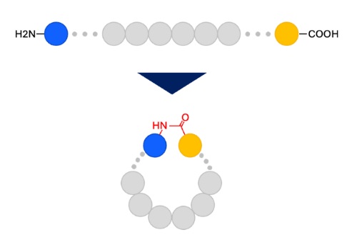 環状ペプチドは自由度の少ない / 固定された立体構造が創出できたり、酵素による分解を回避しやすいなどの利点から、ペプチド創薬研究の一つのアプローチとして古くから知られていましたが、合成難易度の高さから目的の環状ペプチドを得ることは難しいものでした。