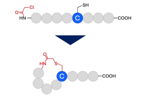 スクラム社では、分子内SS結合やHead to tail(N末端ーC末端)の環状ペプチド(fig.1)(fig.2)のみならず、チオエーテルやステープルによる環状ペプチドにも対応いたします。(fig.3)(fig.4)