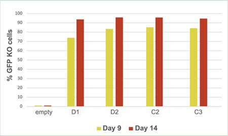 形質導入の9日及び14日後にFACSで細胞を解析したところ、9日後には少なくとも70%、14日後には少なくとも90%の細胞でGFP発現の消失が確認できた。(