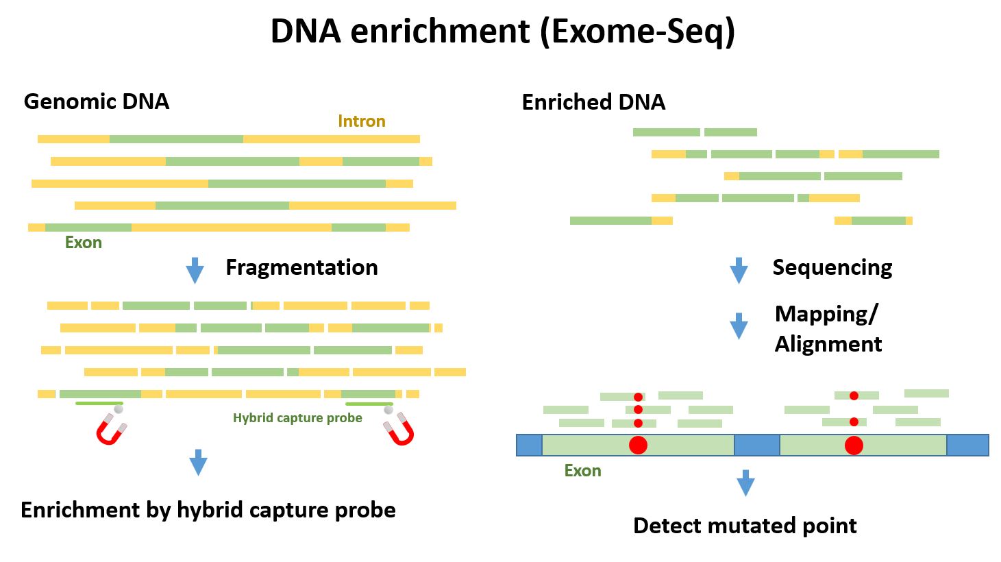キャプチャープローブを用いてゲノムDNAからコーディング領域のDNAを濃縮、シーケンシングすることで特定領域に絞った変異解析を実施します。エクソン領域の遺伝子変異はアミノ酸置換を伴う変異に影響を与える可能性があり、全ゲノムを対象にしたシーケンス解析よりも低コスト、効率的、信頼性の高い(高カバレッジ)のデータを取得することができます。キャプチャープローブは実績多数のアジレント社SureSelectターゲットエンリッチメントシステムを利用します。