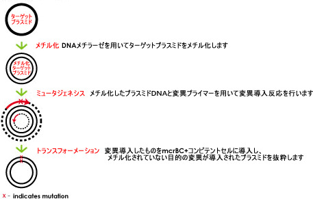 | 1. メチル化 | ターゲットプラスミドをDNAメチラーゼによりメチル化します | 2週間 |