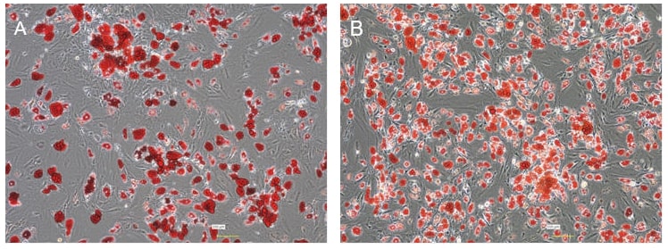 ラット褐色脂肪細胞の脂肪滴を染色後、細胞から色素を抽出し、色素量をマイクロプレートリーダーで測定し、脂肪染色量とした。