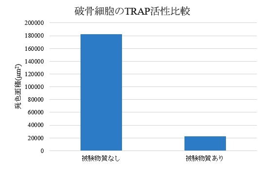 ラット破骨細胞のTRAP染色の発色度合を発色面積を測定して評価した。結果は撮影視野の発色面積の積算値で示した(N=1)。被験物質により、破骨細胞の分化が大きく抑制されたことが明らかとなった。