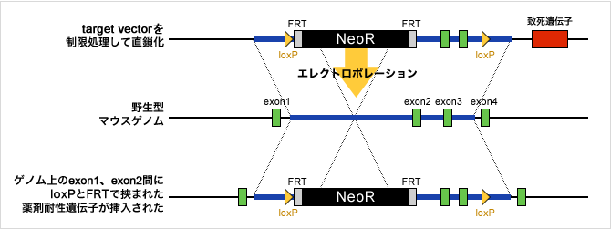 | 薬剤耐性遺伝子の除去 | F1ヘテロマウスとCAG-Flpマウス(あるいは、CAG-Creマウス)との交配により、薬剤耐性遺伝子を除去。 さらに、野生型マウスと交配させ、Flpトランスジーン(あるいは、Creトランスジーン)を除去 |