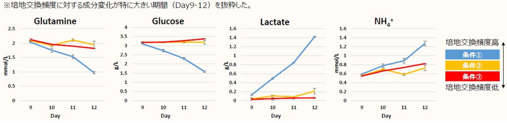 fig.2 iPS細胞の培地交換頻度に対する培養上清の成分変化