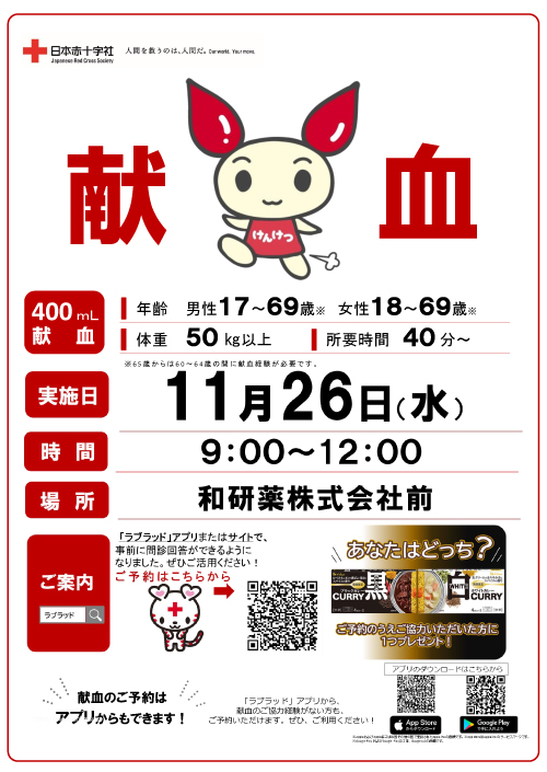 献血にご協力をお願いします! 2025年11月26日(水)9:00~12:00 和研薬株式会社正面駐車場(一乗寺西水干町)